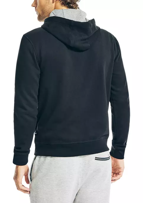 This warm hoodie is just what your cool-weather wardrobe needs. It’s made from fleece-lined cotton knit and features a drawstring hood, side pockets, and Nautica’s J-class logo at the chest.