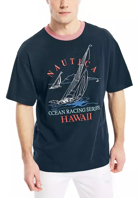 Pulled from Nautica’s archives, this vintage-style t-shirt is crafted from a soft, breathable cotton jersey material. It features an oversized sailing graphic at the front and Nautica’s retro spinnaker logo on the sleeve.