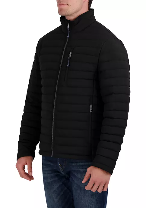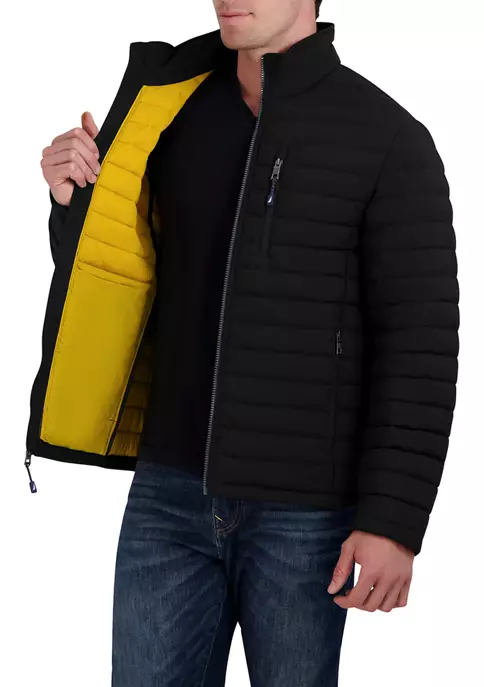 Stay warm in this quilted jacket from Nautica, designed with plenty of stretch for maximum comfort.