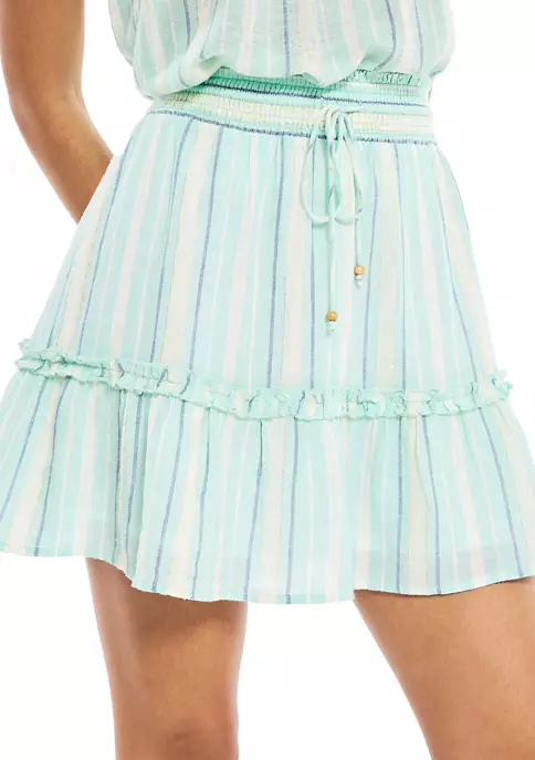 Breeze through the summer with this striped pull-on tiered skirt made from a stretch-linen blend. This style is complete with a smocked waist, sweet ruffle details and an elastic-drawstring waist.