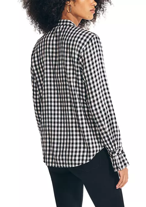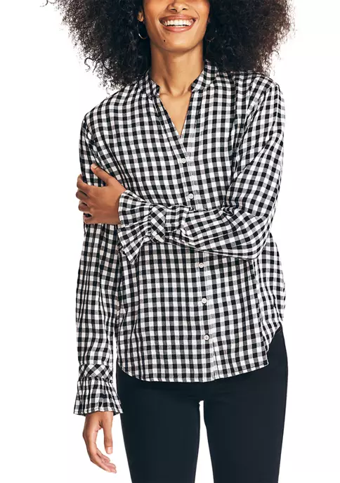 Made from soft cotton knit, this checkered-print boyfriend top features a button-front, long sleeves with feminine ruffle cuffs, and a curved hem. Complete with Nautica’s J-class logo at hem.